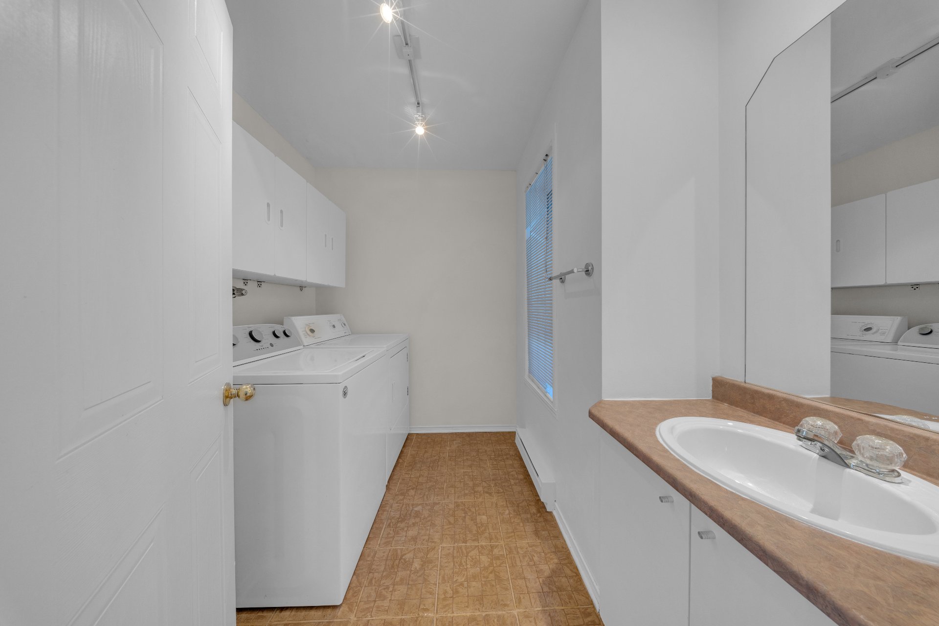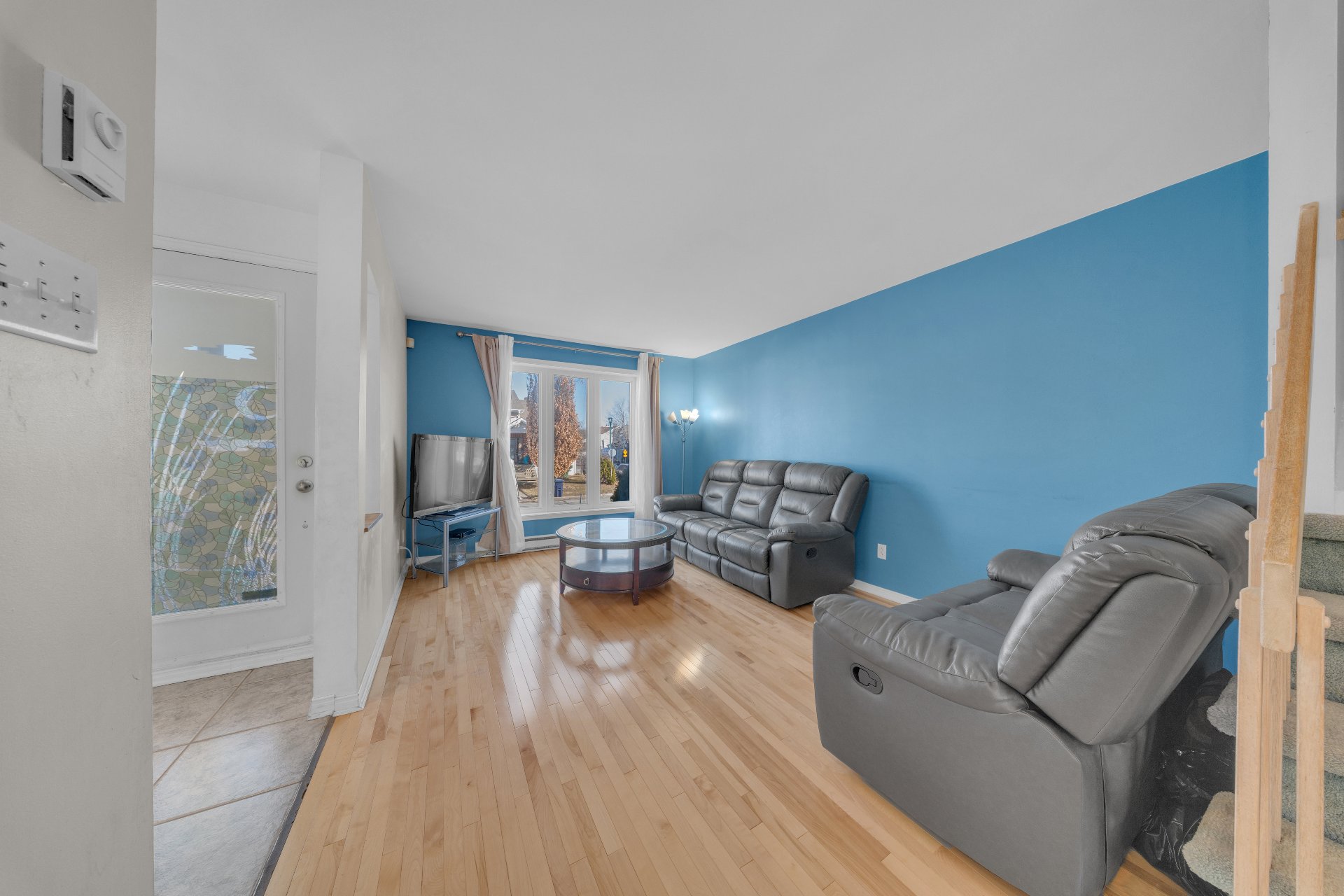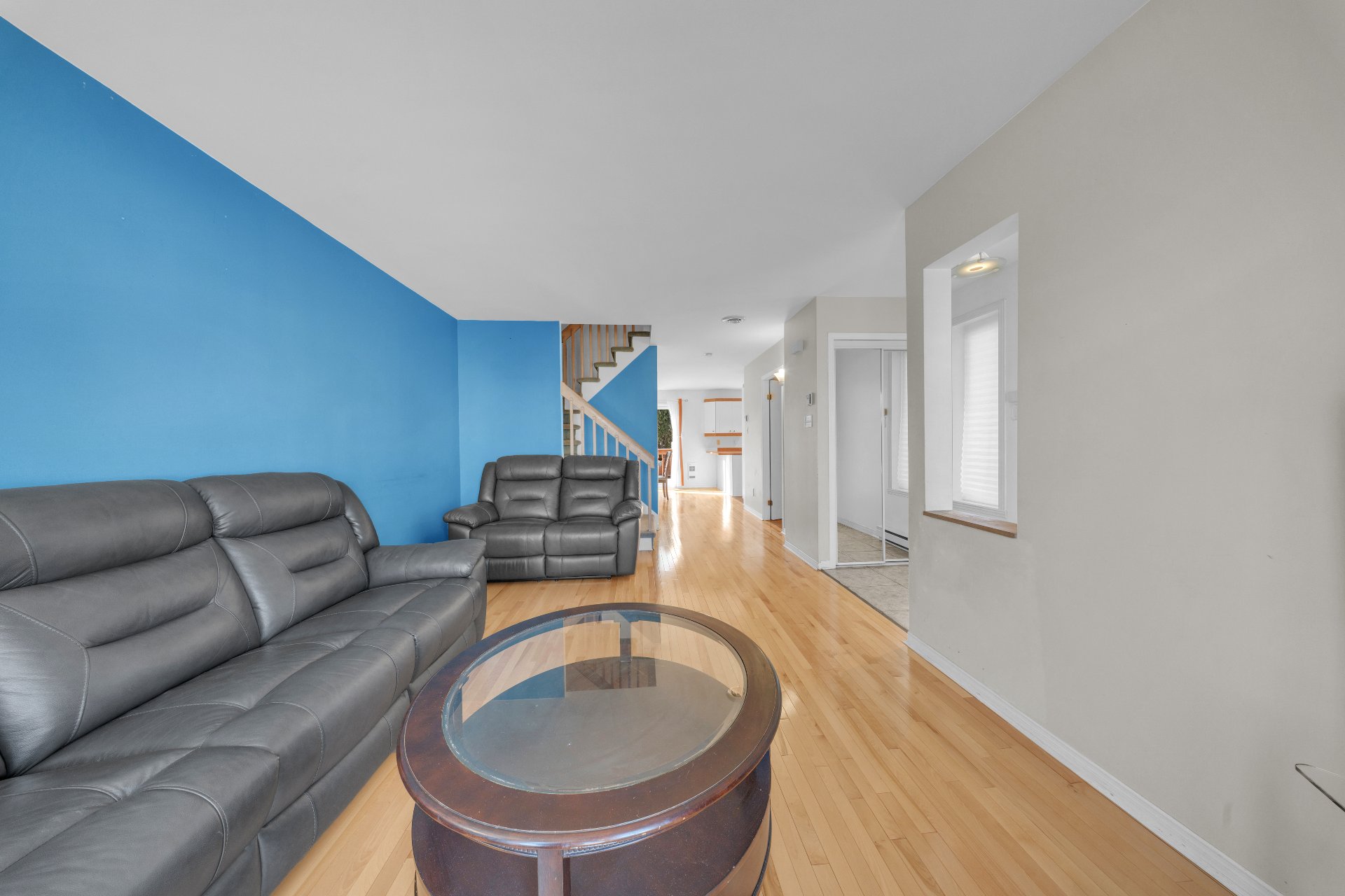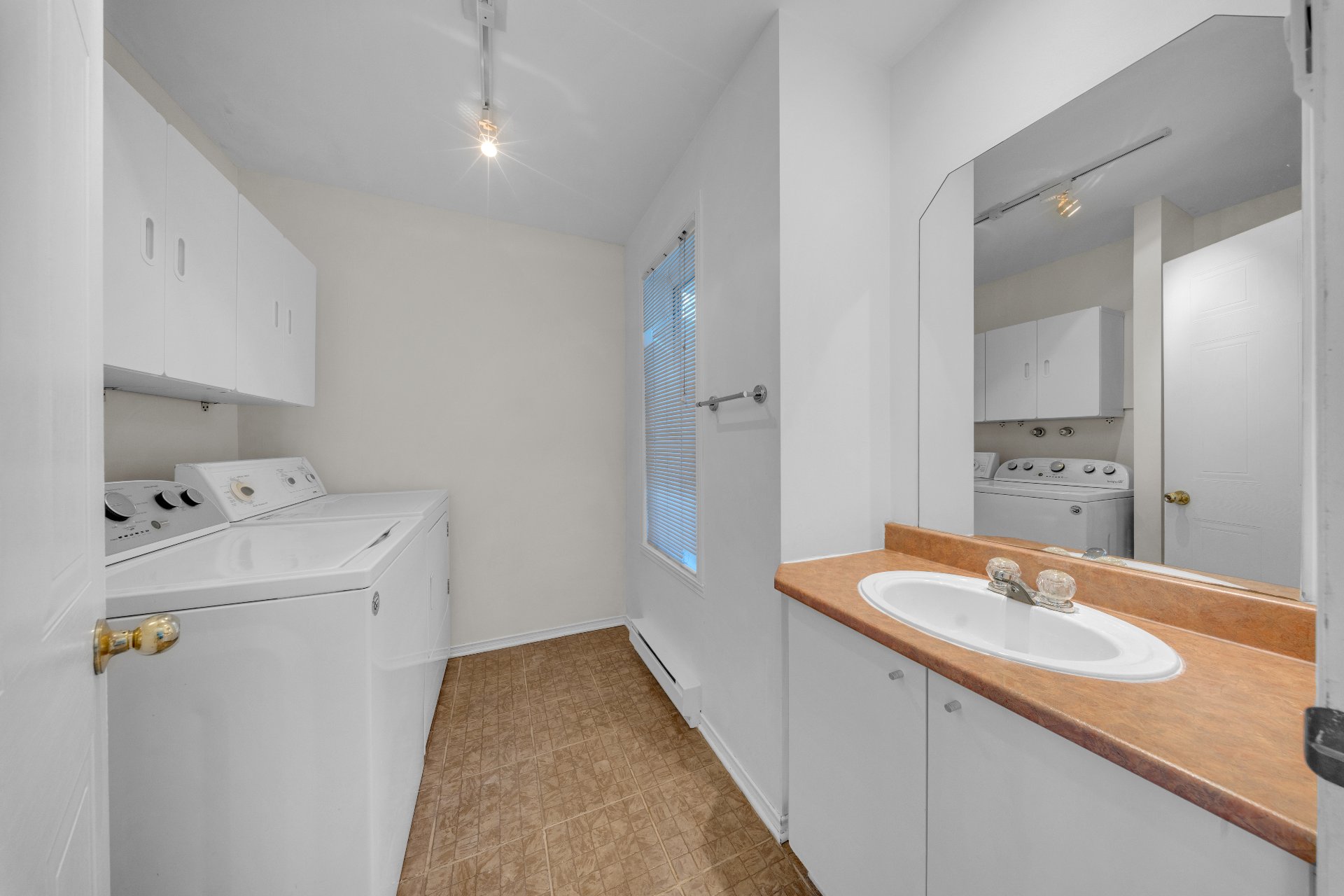 Luminaires, rideaux, stores, air climatisé mural, laveuse-sécheuse, sofa dans la salle familiale au sous-sol, cabanon.