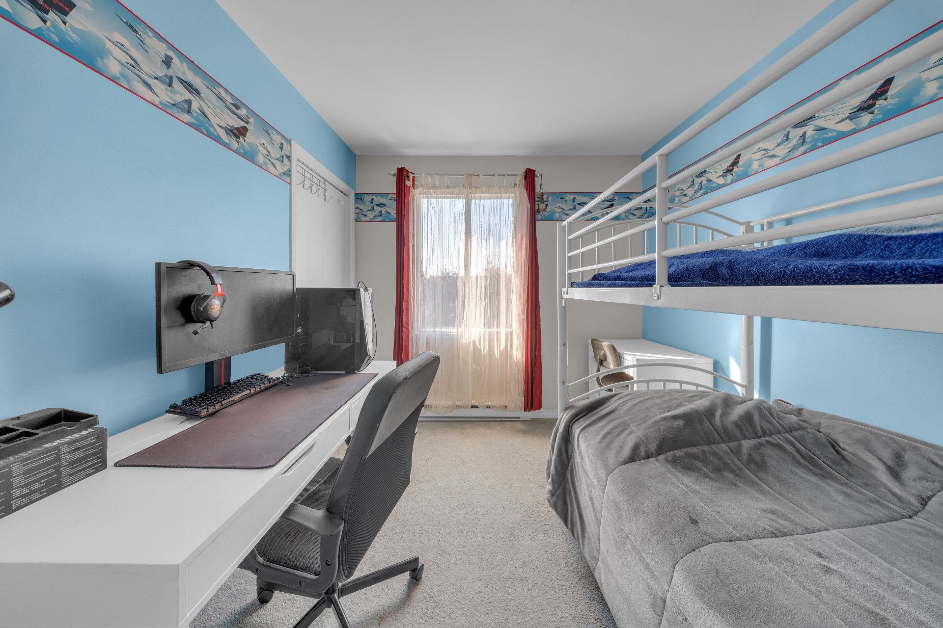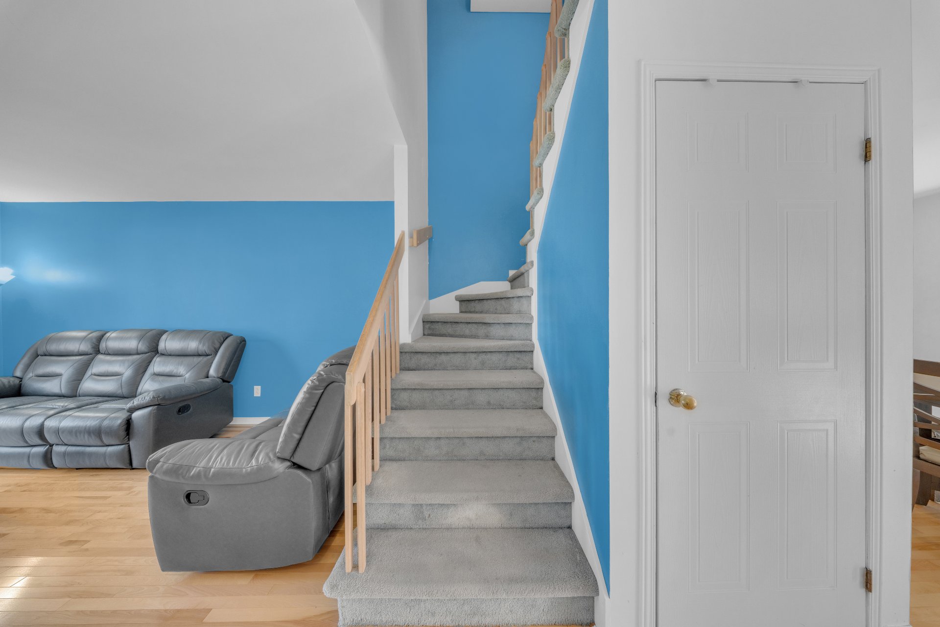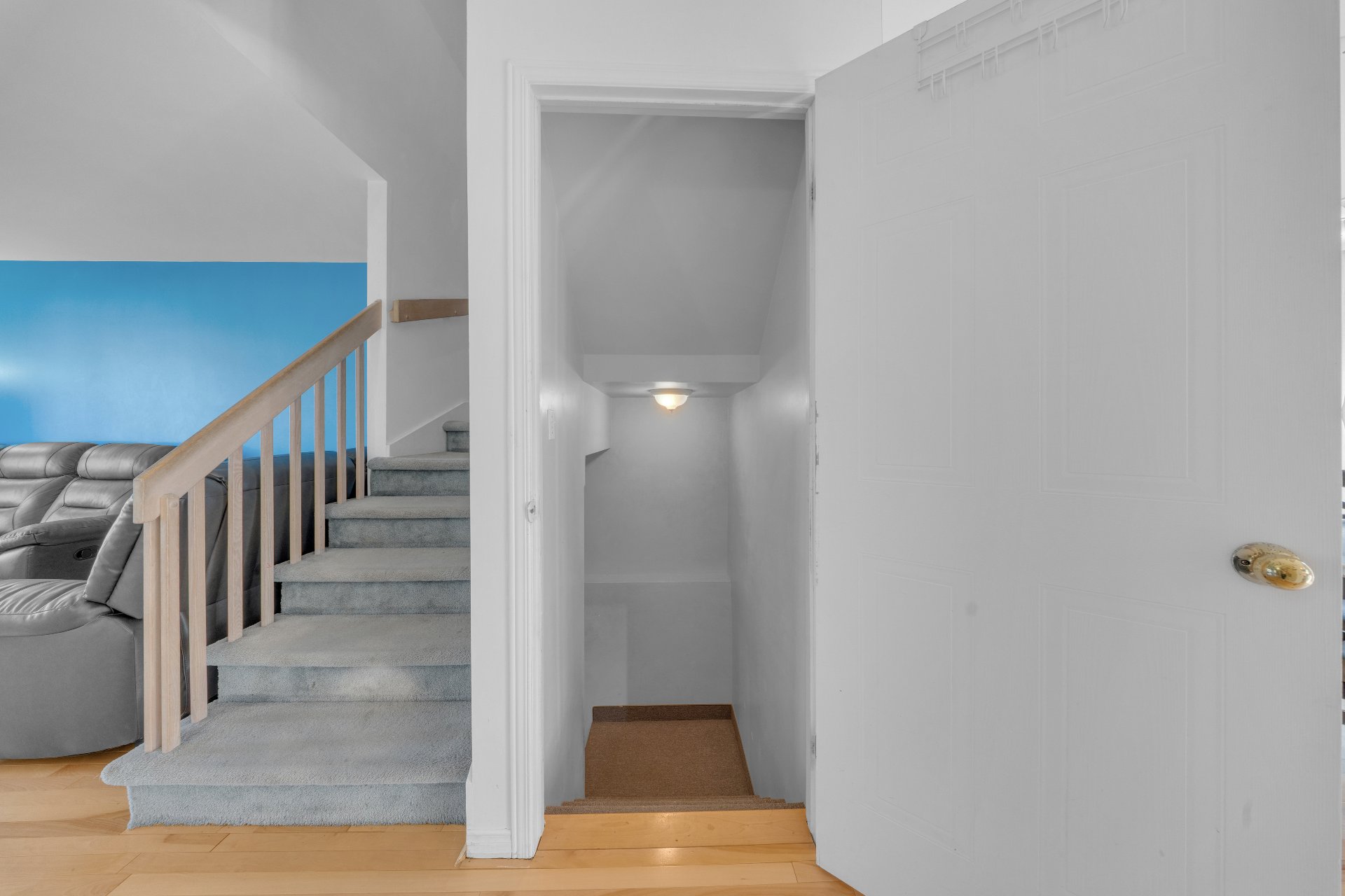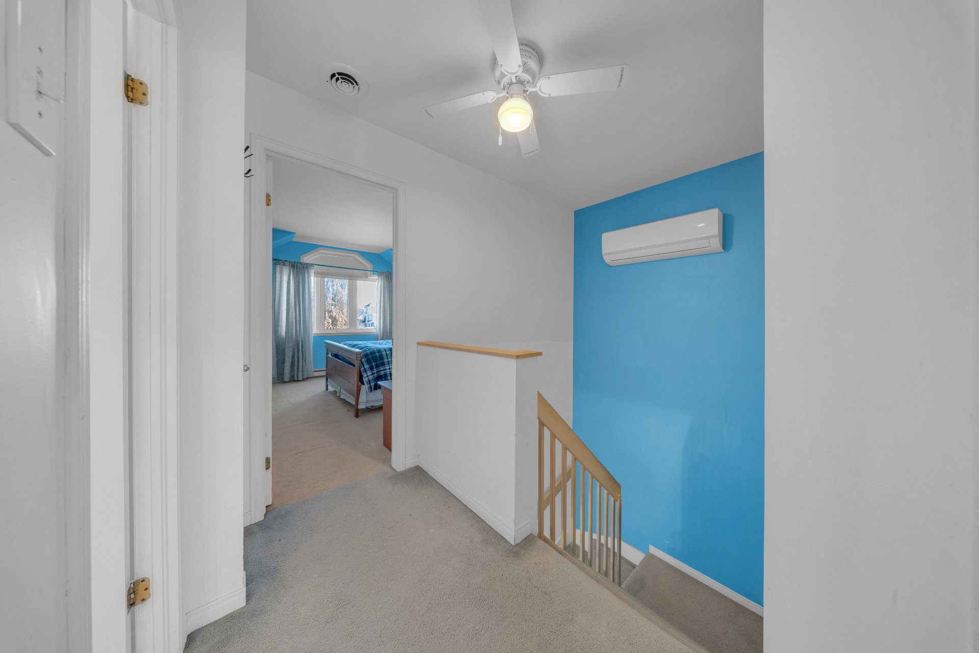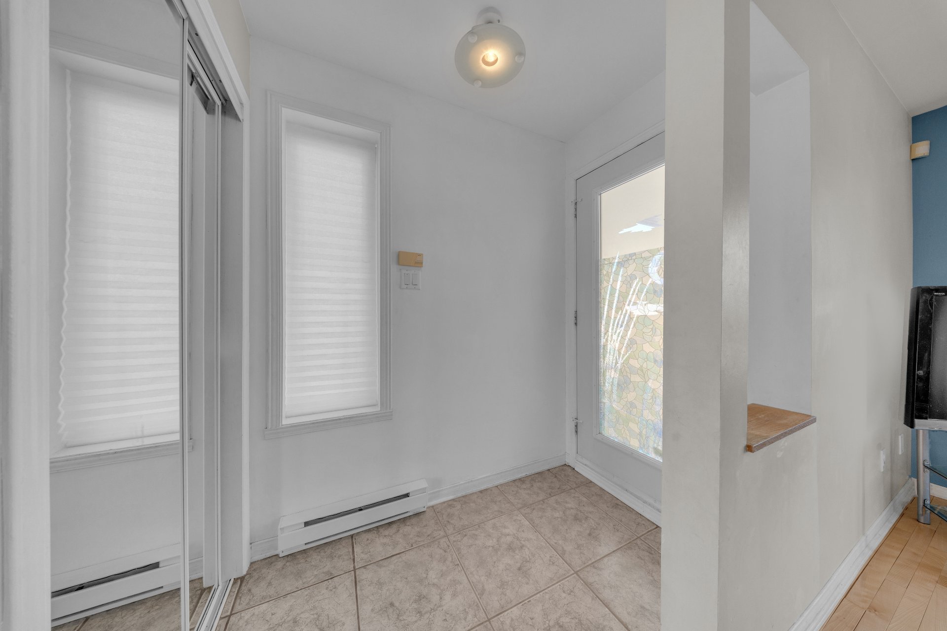Luminaires, rideaux, stores, air climatisé mural, laveuse-sécheuse, sofa dans la salle familiale au sous-sol, cabanon.